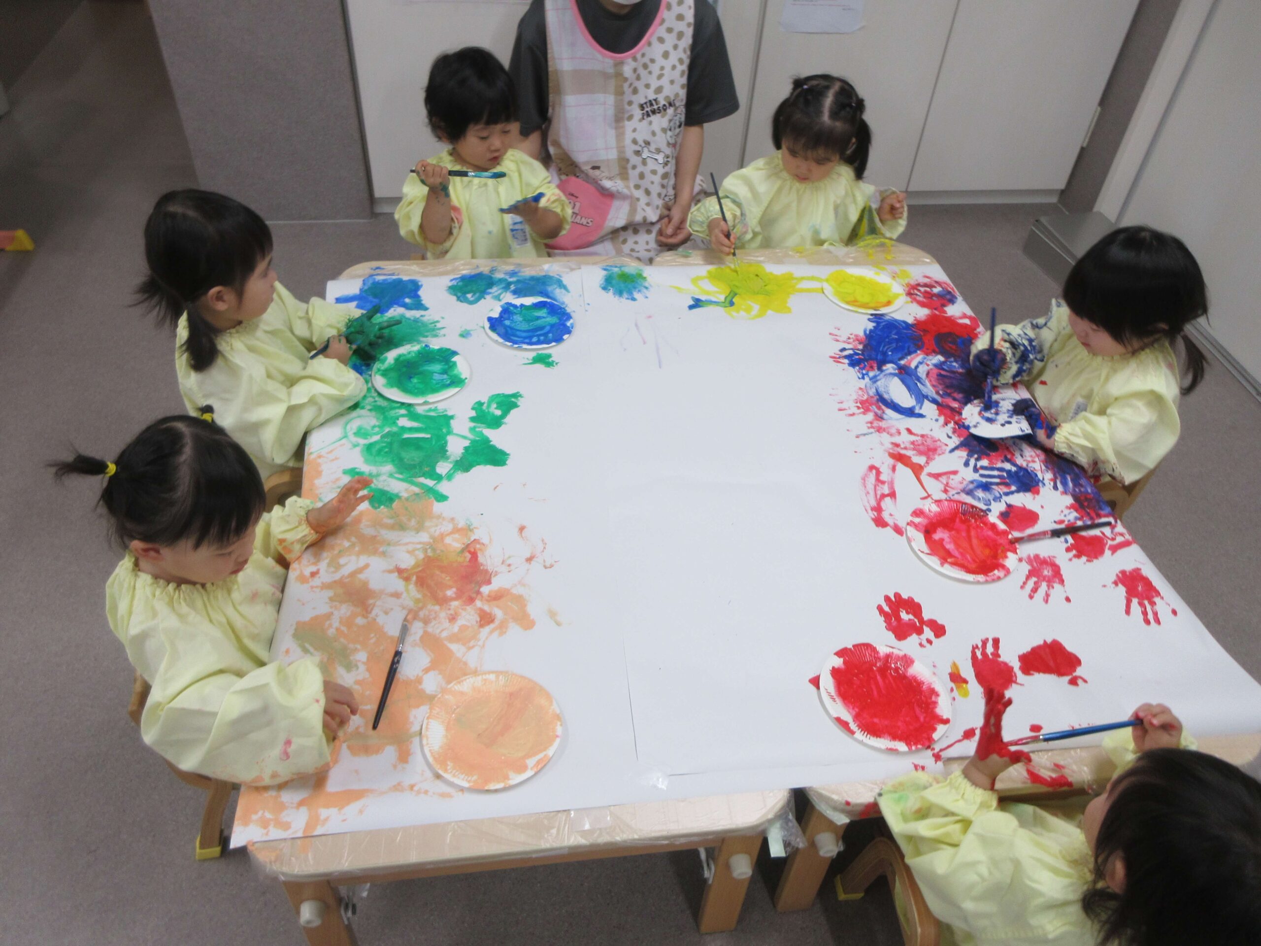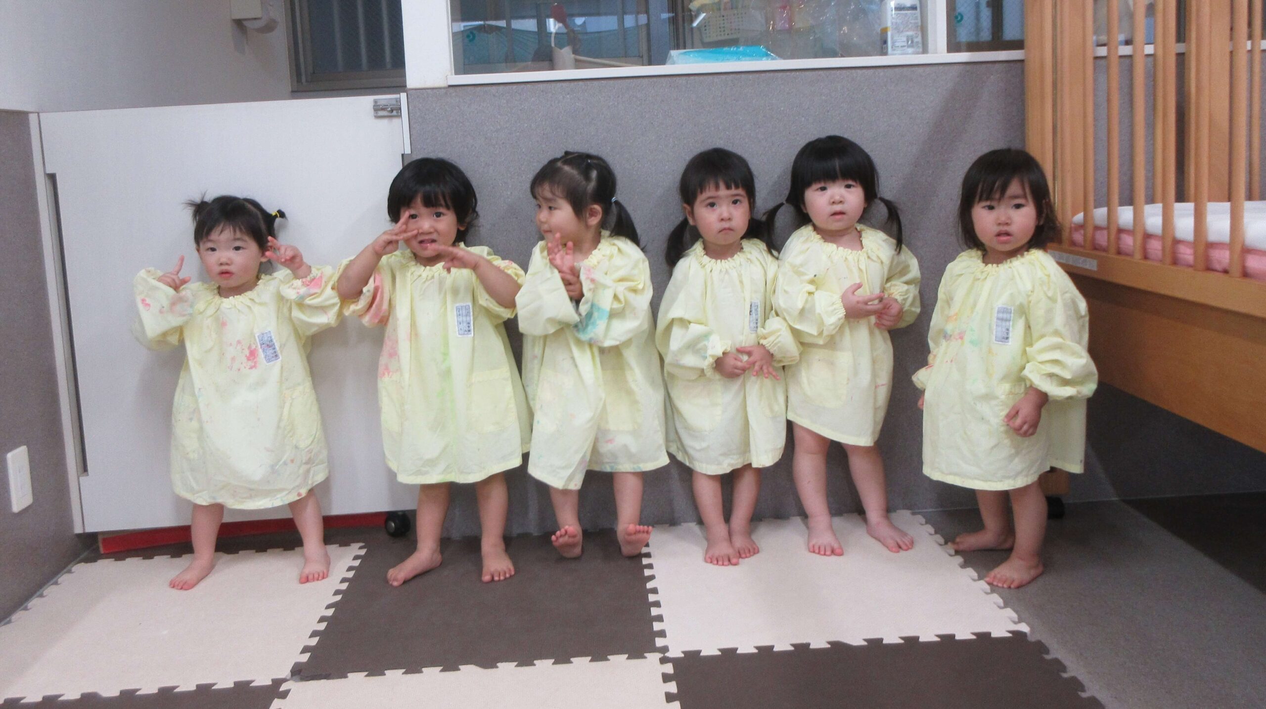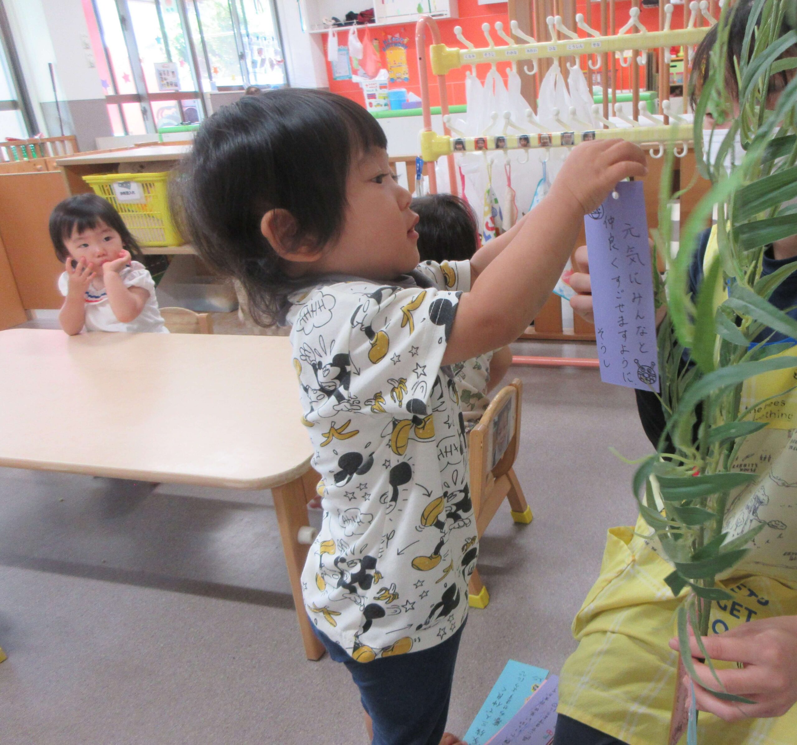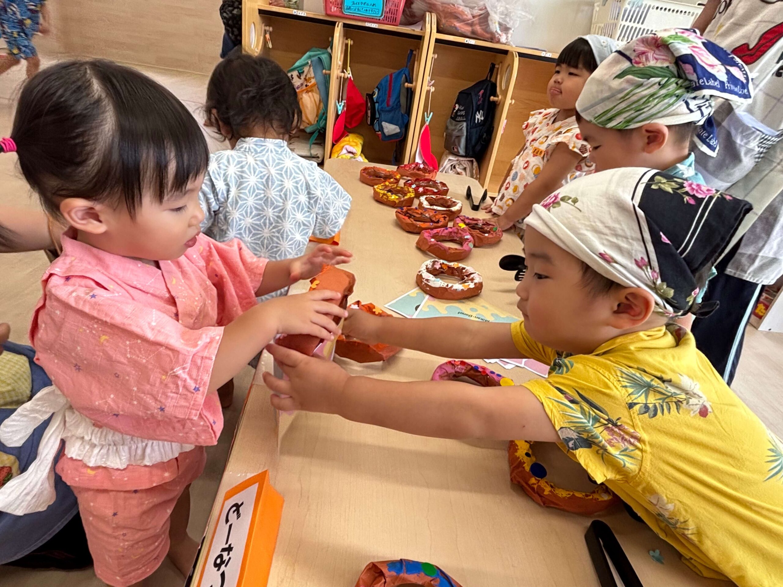 Home お知らせ さくらんぼ組だより【7月】 さくらんぼ組だより【7月】 2025.08.1 お知らせ 7月は、七夕会がありました⭐笹の葉に自分で短冊を飾り、『たなばたさま』のお歌を聞いたり、お店屋さんごっこに参加したりしました。なんとなく七夕の雰囲気を楽しんでくれていたらいいな、と思います😊野菜スタンプや絵の具遊びもしました。手のひらに自分から絵の具を付ける姿が増え、大胆に遊ぶ姿に成長を感じます!少し大きいスモッグを着た姿がとてもかわいいさくらんぼ組さんでしたよ💕8月は、7月に引き続き水遊びがありますので、体調に気を付けながら、楽しみたいと思います!