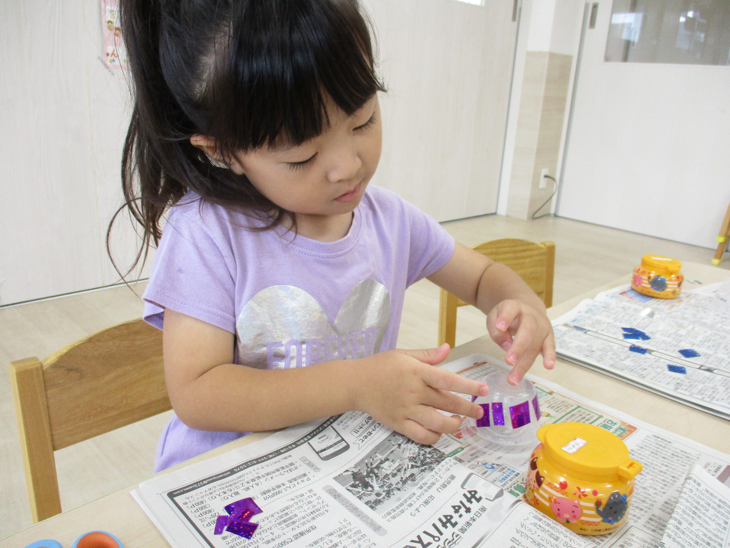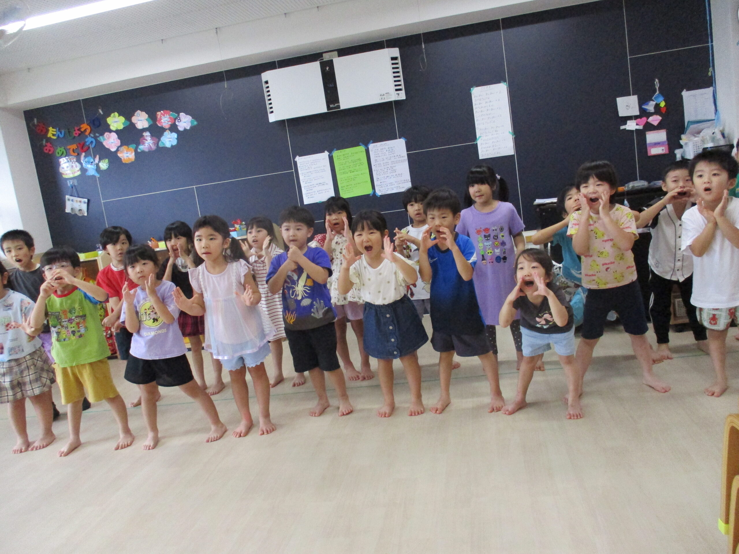 8月は、毎日のように気温が高く、長時間の戸外あそびが難しい日も続きました😖💦室内での活動が多い月でしたが、夏を感じられるような製作や、運動あそび、発表会に向けた取り組みなどを取り入れながら過ごしました🌟🍉お盆休みもあり、クラス全員揃う日は少なく、久しぶりに全員で通してみると、ダンス移動や動きをほとんど覚えており、びっくり!衣装を着て楽しそうに踊る姿が可愛かったです🎵💞また、夏ならではの製作では、ペーパー芯を使った花火スタンプ、ビーチサンダル、プリンカップを使った風鈴作りなどを作ってみました!保育室に入るだけで、夏を感じられるような製作となっていますので、持ち帰った際は、ぜひお家に飾ってみて下さいね!🤩9月は、いよいよ発表会本番!これまで取り組んできたことを子どもたちが自信を持って楽しく発表できるように、全力でサポートしていきたいと思います!もうすでに『いっぱいおきゃくさんくるのかなぁ~』『ままとぱぱにみせたい!』とドキドキやワクワクでいっぱいの子どもたちです😄当日、お楽しみに~🎵❤まだ夏の暑さも続きますので、体調面に注意しながら、疲れが溜まらないように活動していきたいと思います。ご家庭でも体調に変化が見られましたら、お知らせくださいますよう、よろしくお願いいたします😌