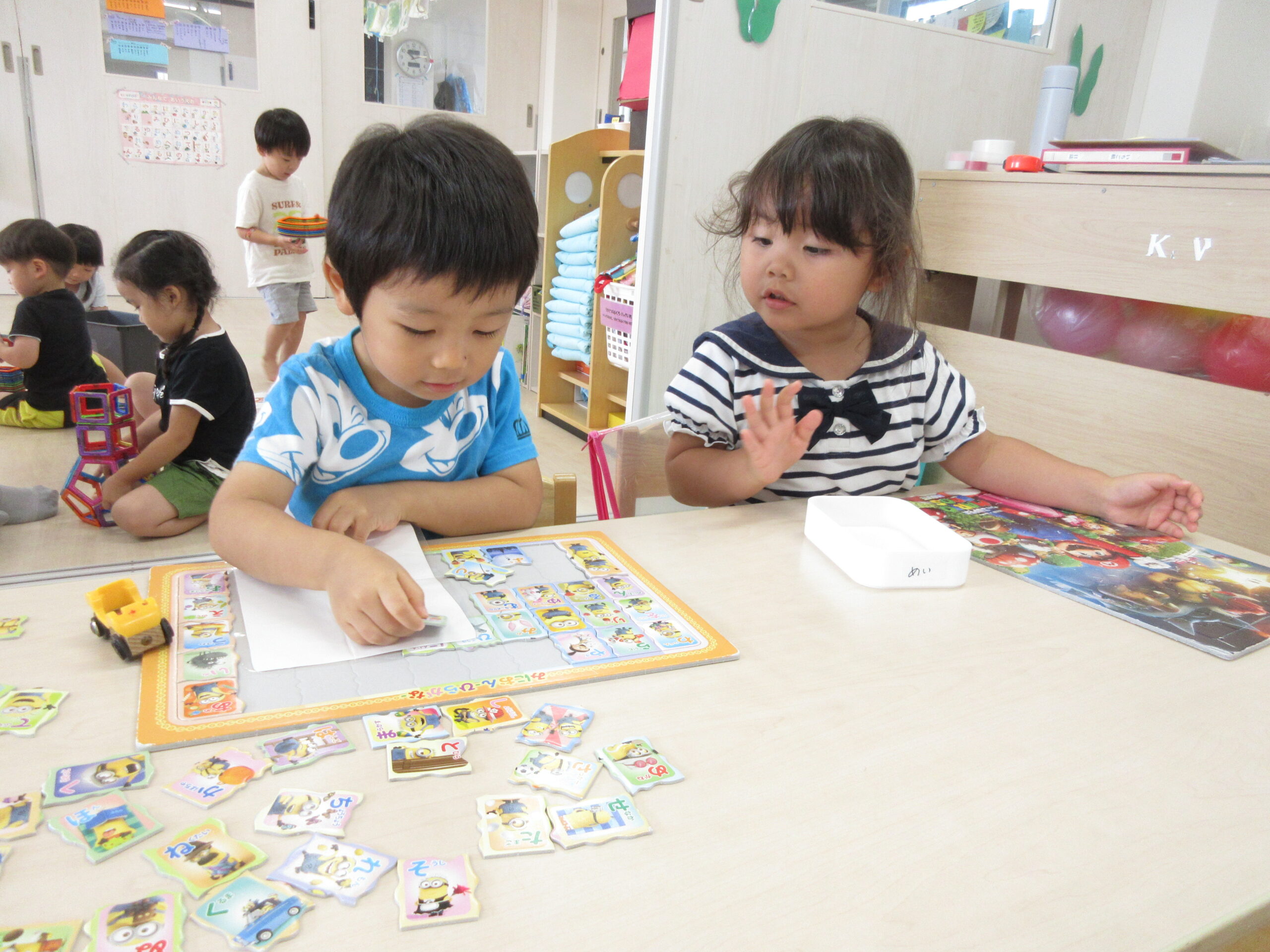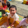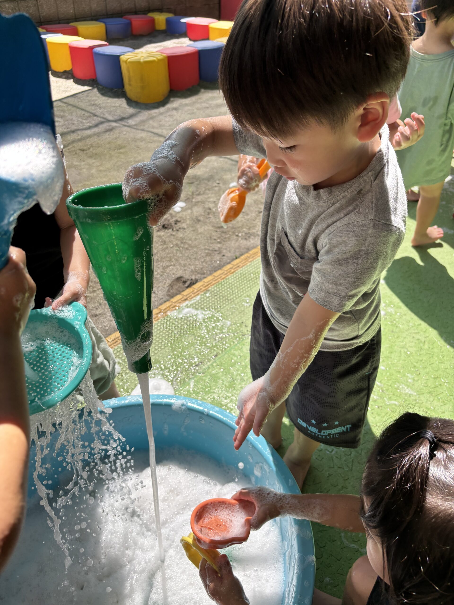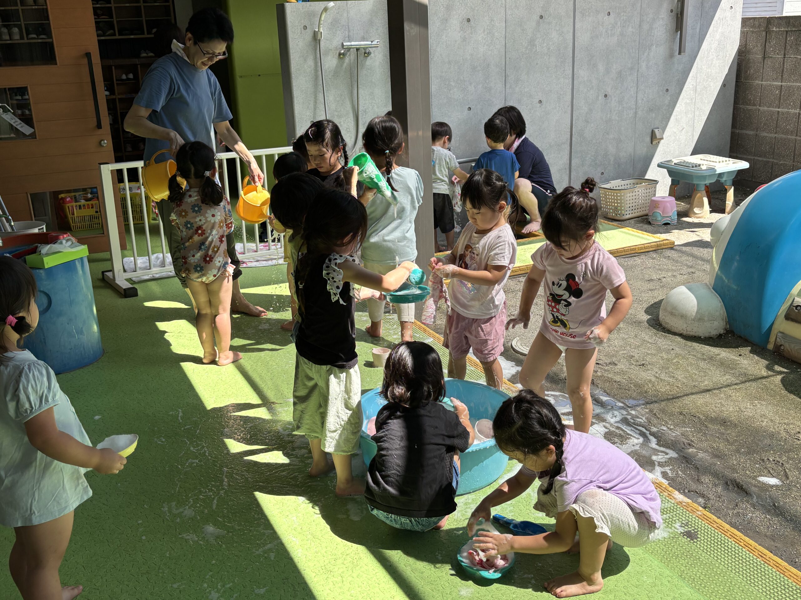 8月は、プール遊びや泡遊びなど夏ならではの遊びを楽しみました。泡遊びでは、石鹸を下ろし器で下ろし粉にするところから見て泡作りを楽しみました。石鹸の匂い、感触などを楽しみ、タライの中の水に石鹸粉とお砂糖を入れジャバジャバと手で泡立ててたくさんの泡作りを楽しみました。泡でかき氷を作ったり、ハンカチを洗濯して遊びました。ロープに干すことも上手でしたよ。発表会に向けてのお遊戯と歌の練習も始まりました。歌は、「犬のおまわりさん」の曲に合わせてネコさんポーズや犬さんポーズで可愛く表現していますよ。お遊戯曲は「ダンスホール」の曲に合わせてカッコよく踊っています。当日を楽しみにしていてくださいね。9月は発表会に参加して大きな舞台を経験し成長する姿が楽しみです。まだまだ暑さが続きますので引き続き熱中症対策を心がけ元気に過ごせるように配慮していきたいと思います。