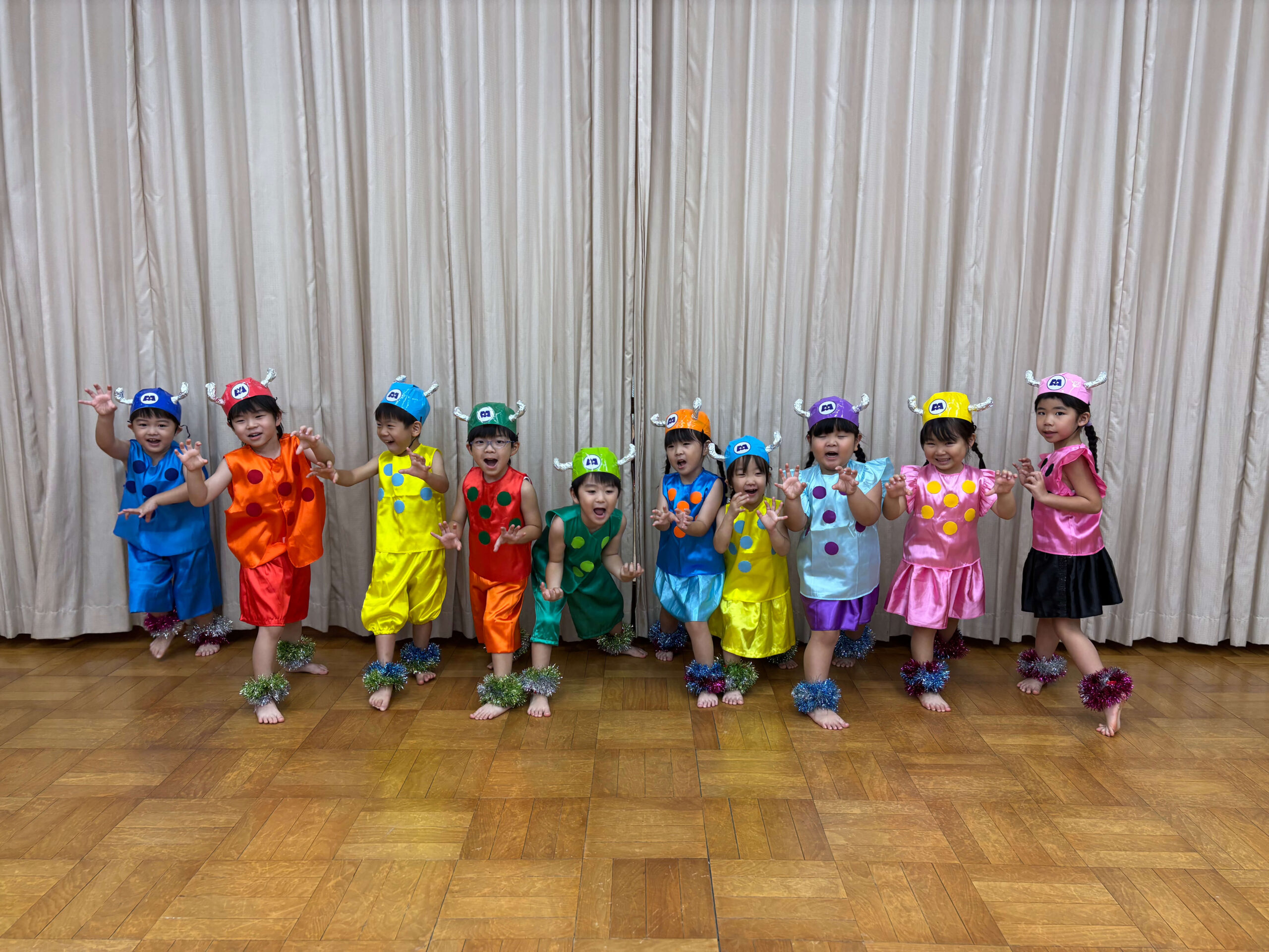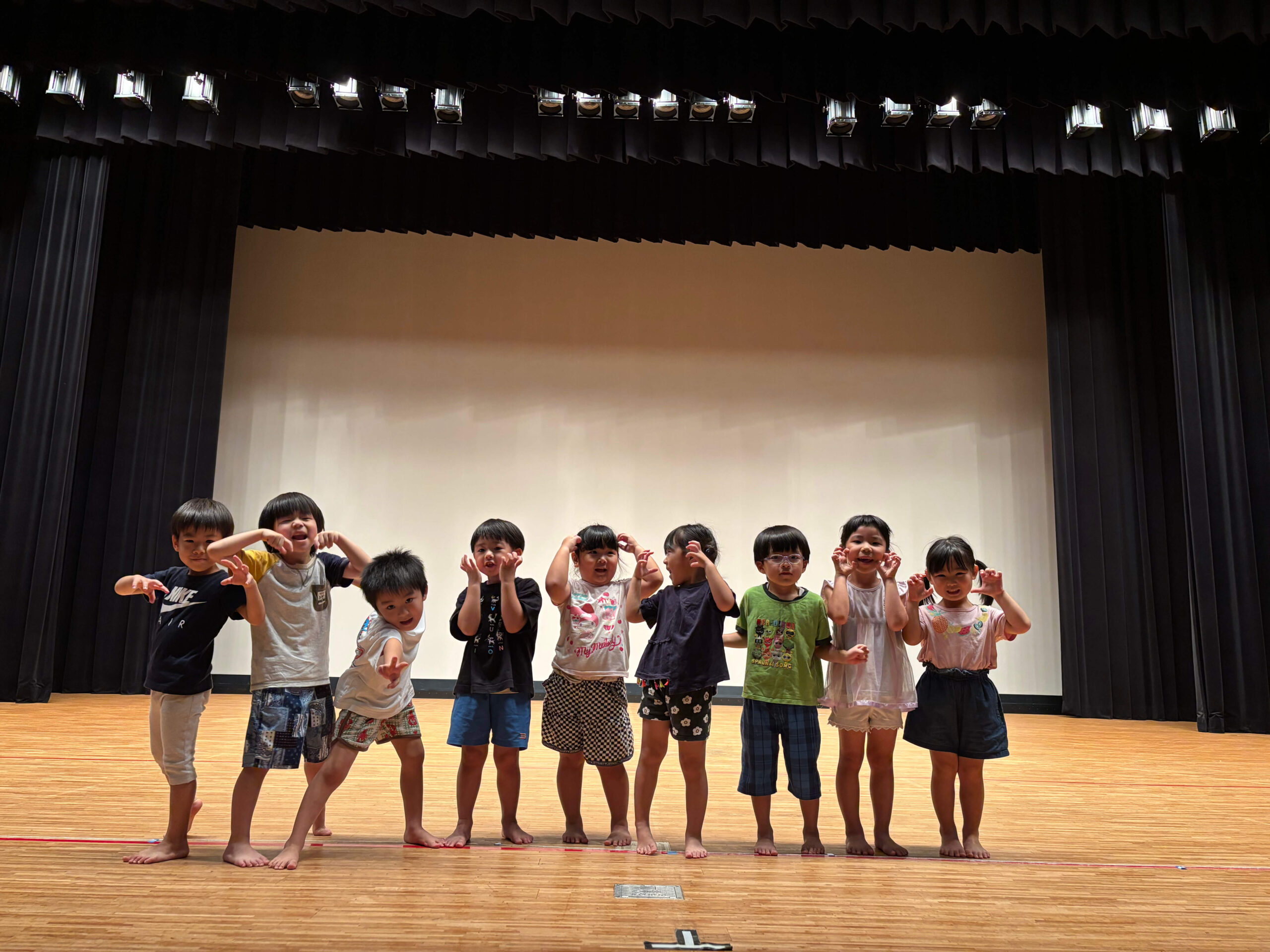 先日行われた発表会、たくさんのご参加ありがとうございました!😊これまで当日に向け、歌やダンス、リズムあそびをクラス全員でたくさん取り組んできました!リハーサルでは、ドキドキした表情も見られていましたが、当日の自信あふれた楽しそうな姿がとても素敵でした💕次は11月に運動会を予定しております!発表会での自信を活かしながら、バルーンやかけっこ、リレーなど楽しく取り組んでいきたいと思います!引き続き、体調面に気を付けながら、園外での活動も取り入れていきたいと思いますので、よろしくお願い致します!