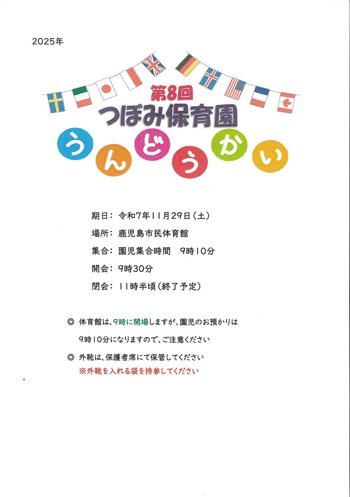 Home お知らせ 令和7年度 運動会開催について 令和7年度 運動会開催について 2025.11.6 お知らせ 11月29日(土)の9時半より、鹿児島市民体育館にて第8回運動会を開催します! 「小学生かけっこ」もありますので、地域の皆様のご観覧と参加を是非お待ちしております!