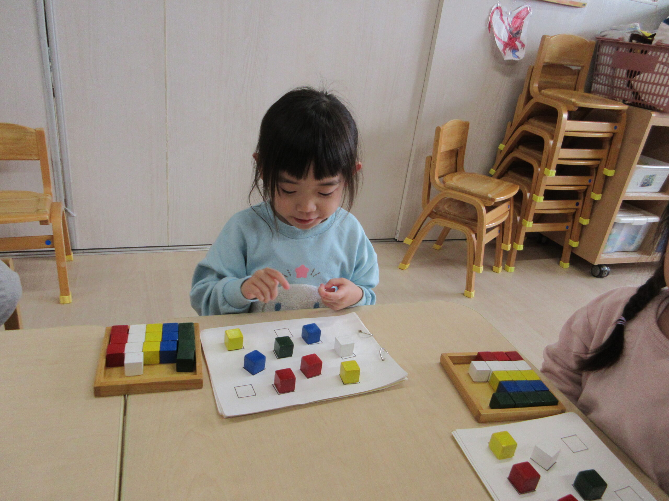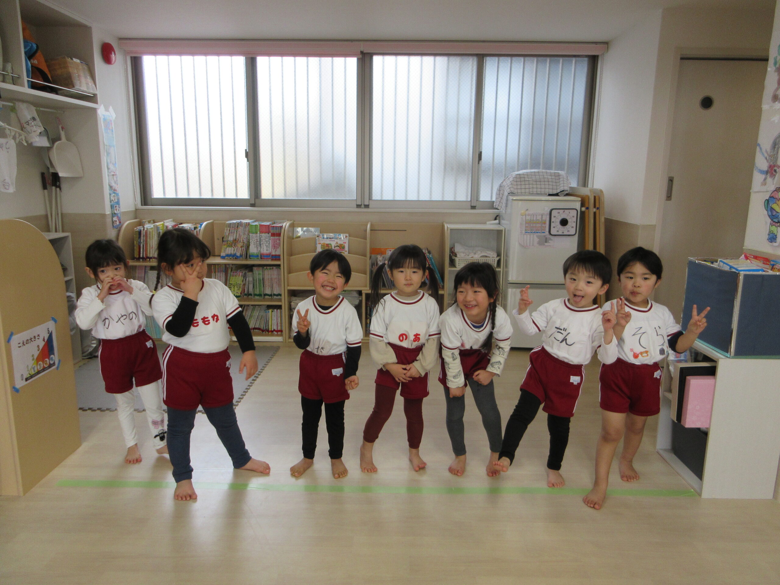 2月は節分の行事に参加しました。自分で作ったお面をかぶり、鬼が登場すると新聞豆をまき鬼を退治しました。その後は、豆まき、色塗り、輪投げ、重ねコップのコーナーに分かれて好きな遊びを楽しみました。2月より異年齢児保育が始まりました。今までと生活の流れや環境が変わりましたが、朝の身支度を自分で行い出席シールを自分で貼り、好きな遊びを始めます。異年齢のお友だちの遊びに刺激を受けながら真似たり、やり取りを楽しんでいますよ。ロッカー上のウオールポケットにお手紙が入っている際は、保護者の方に取っていただくことになっていますので毎日確認をされれください。