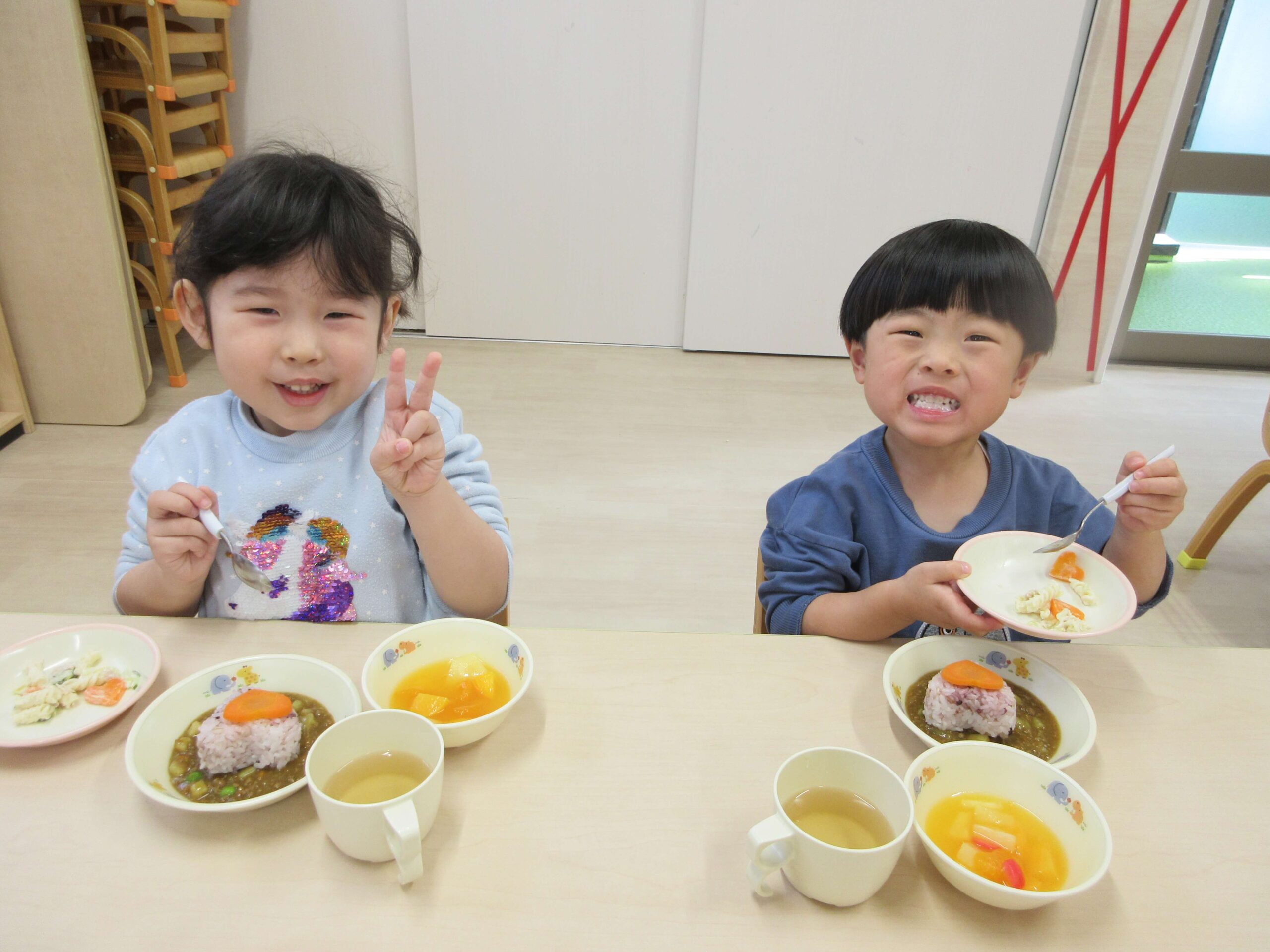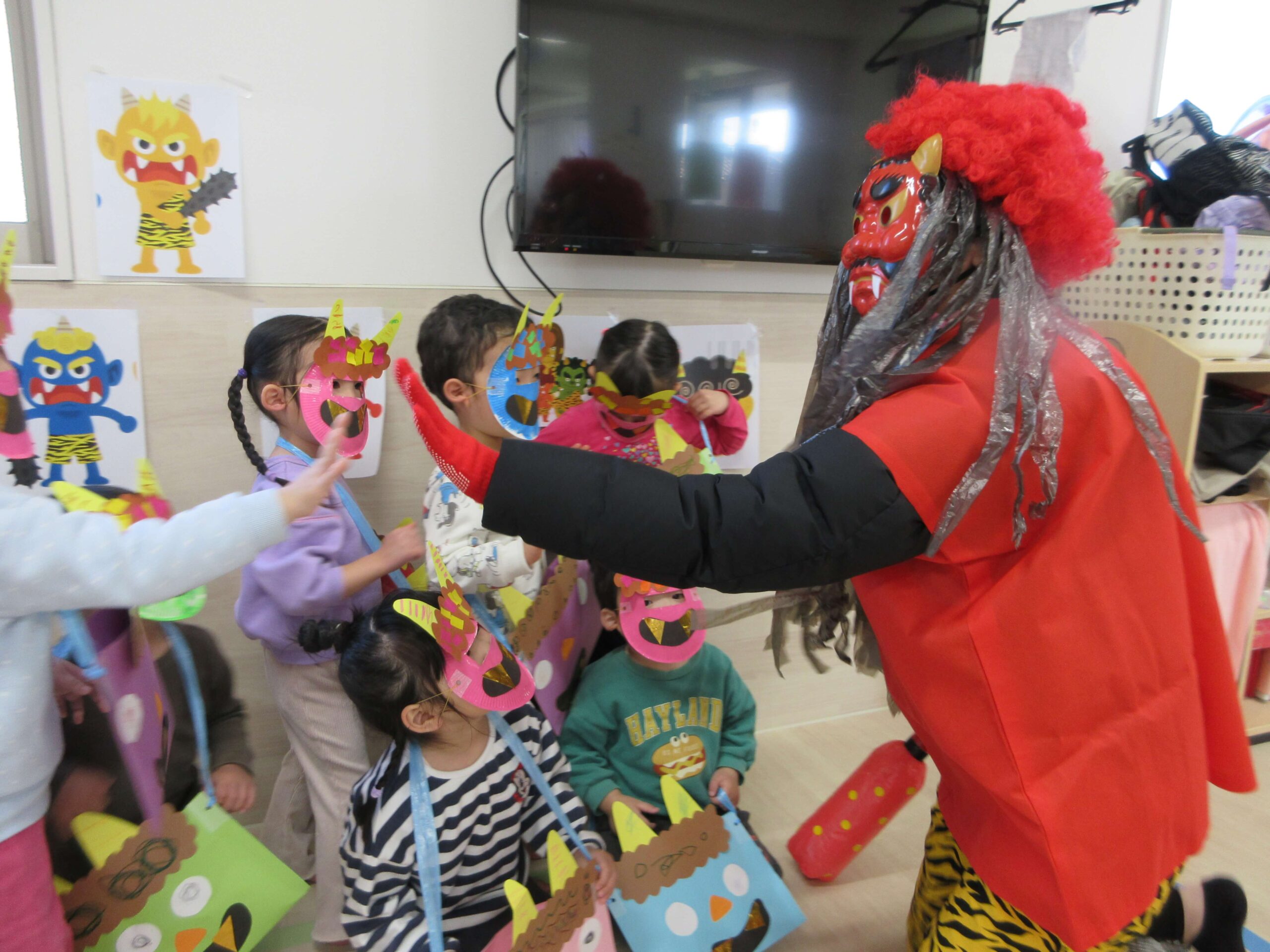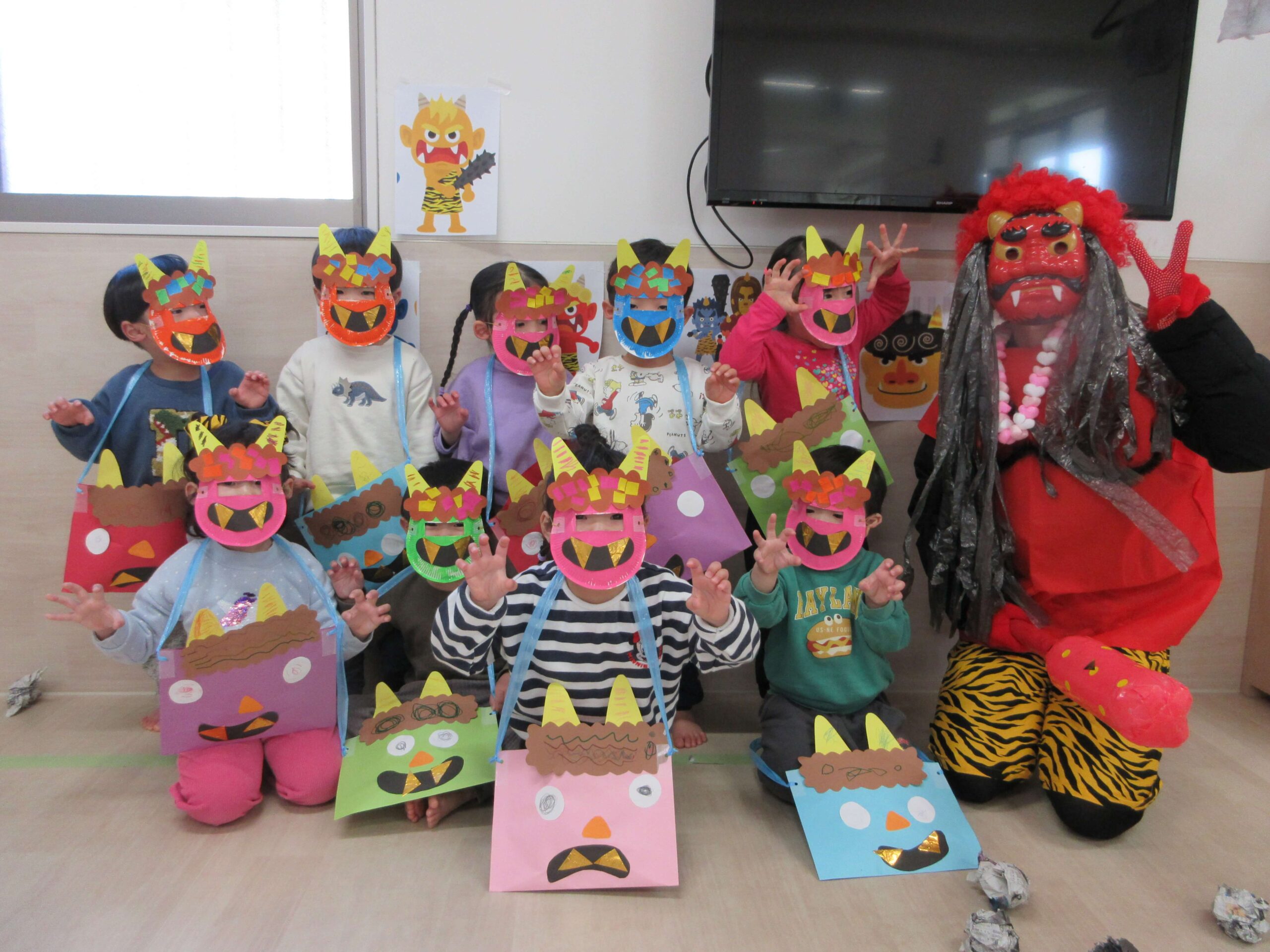 2月は節分の行事に参加したりひな人形製作をしたりして楽しみました🎵節分では鬼さんの登場に驚いていましたが元気よく「鬼は外~福は内~」と言いながら豆を投げることができました😊✨最後は仲良く写真も撮りましたよ!ひな人形製作は糊やクレヨンを使って顔を描いたり花を貼ったりして作りました。とてもかわいいひな人形ができました😁💕また雪が降った日もありましたね!雪が降った日は保育園はお休みでしたが次の日に園庭に残っていた雪を触りました⛄「つめた~い」「ふわふわする~」など言いながら雪の感触を楽しんでいましたよ🎵早いものでみかん組さんでの生活も残り1か月となりました。進級の準備を進めながら子どもたちともたくさんの思い出を作っていけたらと思います😊❤️