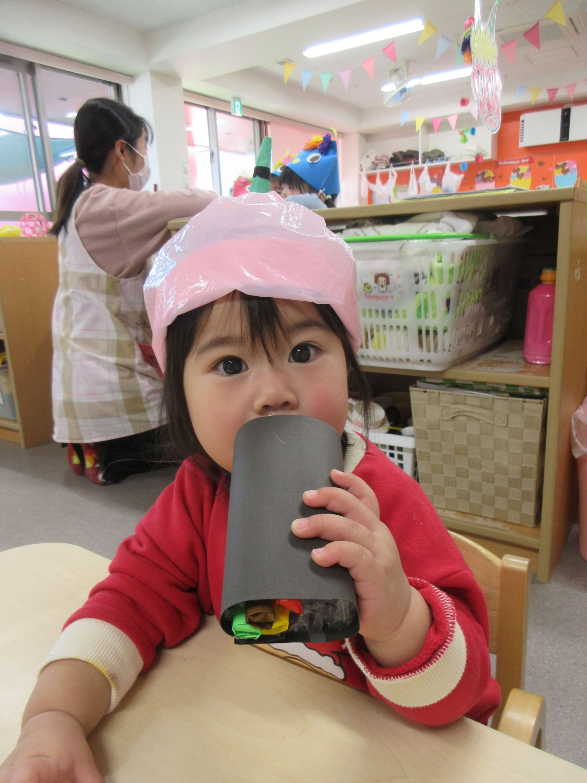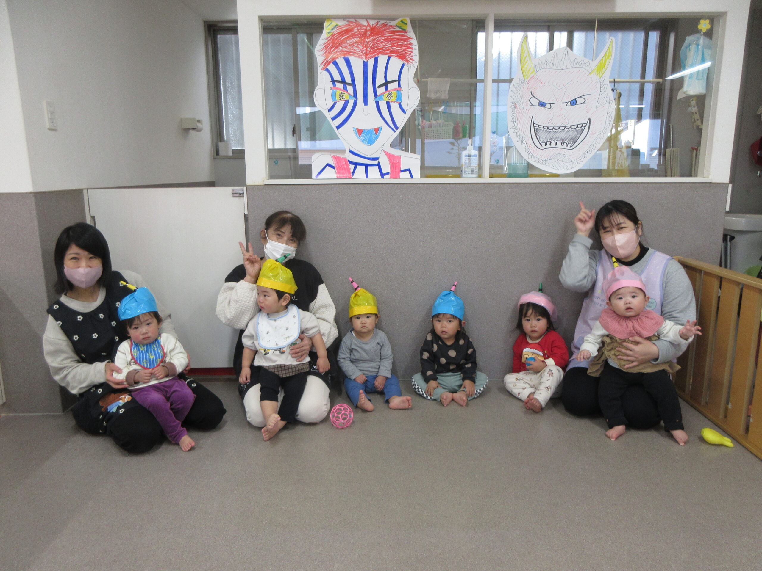 2月は、初めての豆まき会に参加して、お天気のいい日には戸外でたくさん体を動かして楽しみました!豆まき会では、手作りボーリングや鬼の的あてに恵方巻き作りをして楽しみました🎵最後に鬼さんが登場し、みんなで豆まきをして退治しましたよ✨戸外あそびではあそぶ前の約束事を聞いたり、保育士の問いかけに「はーい」とお返事をして応える姿も見られるようになりました😊滑り台の上り下りも一人で行い、小さいお友だちに玩具を貸したりと、成長を感じさせる場面がたくさんありました💕もも組さんでの生活も残り1カ月!3月もみんなで楽しく様々な活動に取り組んでいきたいと思います🥰🎶